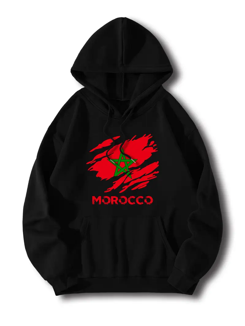 Dégagé Sweat à Capuche Imprimé Maroc – Tissu Tricot Polyester Casual avec Légère Élasticité, Taille Régulière à Enfiler avec Poche, Style Col Montant pour Automne/Hiver