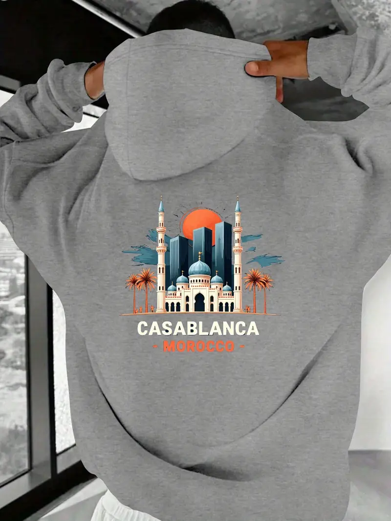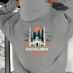 Sweat à Capuche Graphique Casablanca Maroc pour Hommes – Pull Douillet à Manches Longues avec Poche Kangourou, Tissu en Tricot de Polyester, Design Urbain avec Mosquée & Palmiers, Parfait pour les Activités Extérieures en Automne/Hiver