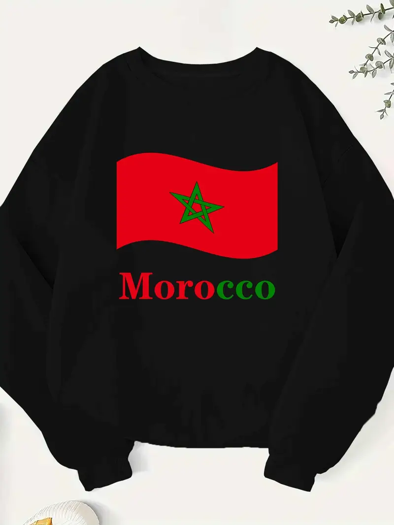 Sweatshirt pour Femme Inspiré du Drapeau Marocain – Col Rond Vert Confortable avec Imprimé Graphique Rouge & Vert, Pull Décontracté en Polyester pour Automne & Printemps, Lavable en Machine.