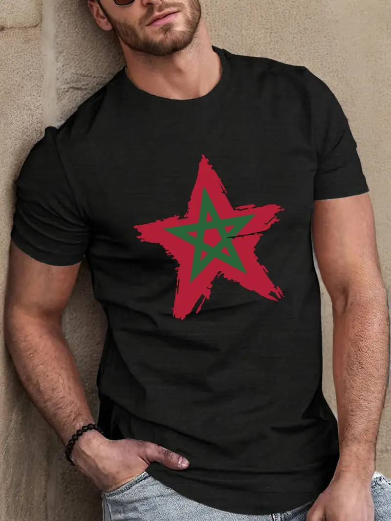 T-shirt décontracté à col rond pour homme avec impression d’étoile du Maroc, tissu tricoté 100 % polyester, légère élasticité, coupe régulière, tee-shirt à manches courtes d’été.
