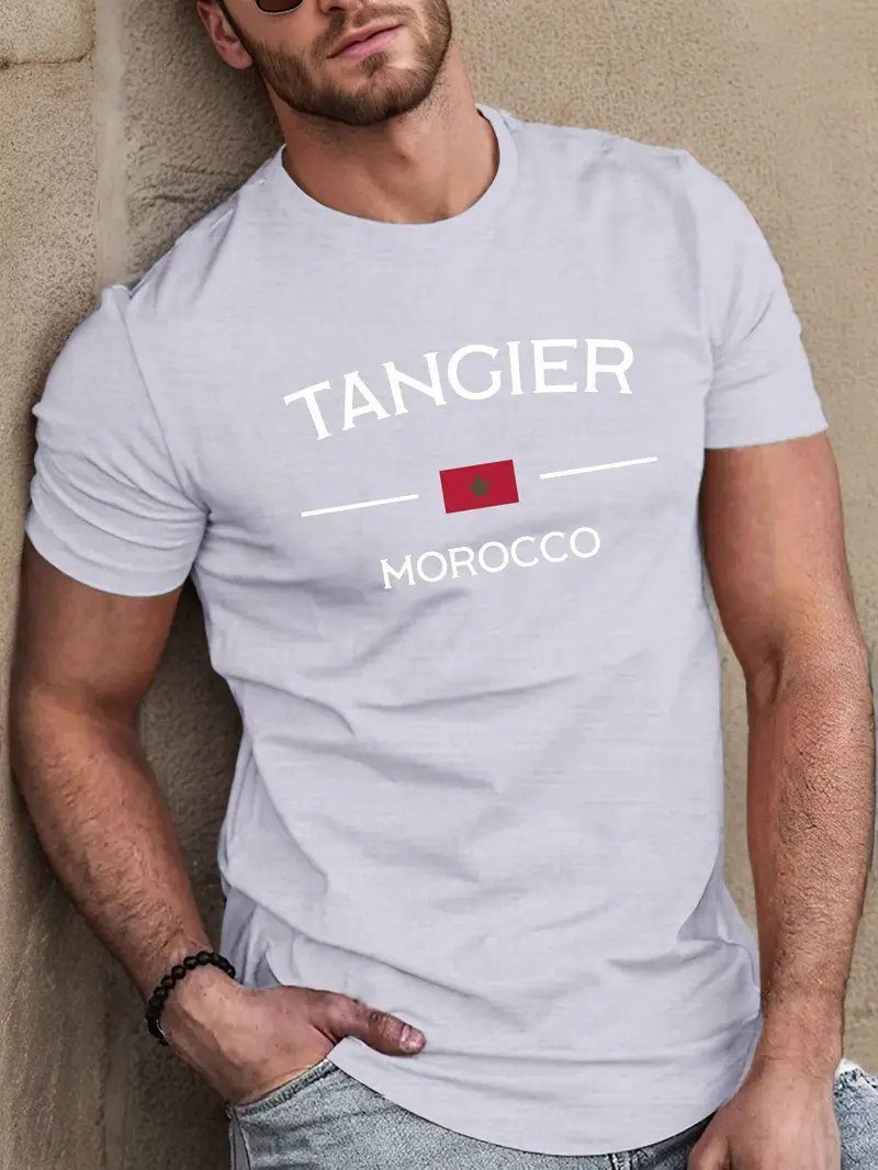 T-shirt Décontracté pour Hommes avec Imprimé Tanger Marocain, Manches Courtes, Tissu en Tricot 100% Polyester, Motif Géométrique, Col Rond, Léger et Respirant pour l’Été, Coupe Régulière, Lavable en Machine, Tailles Adultes, Beige avec Design Graphique Rouge et Blanc.