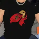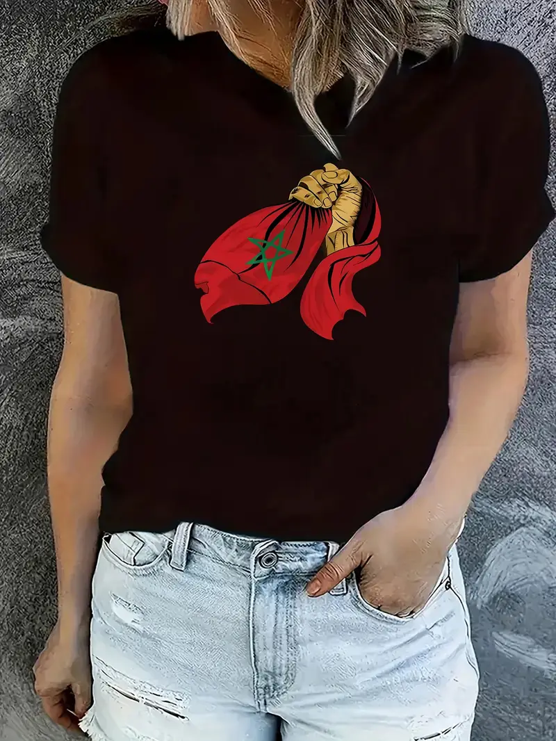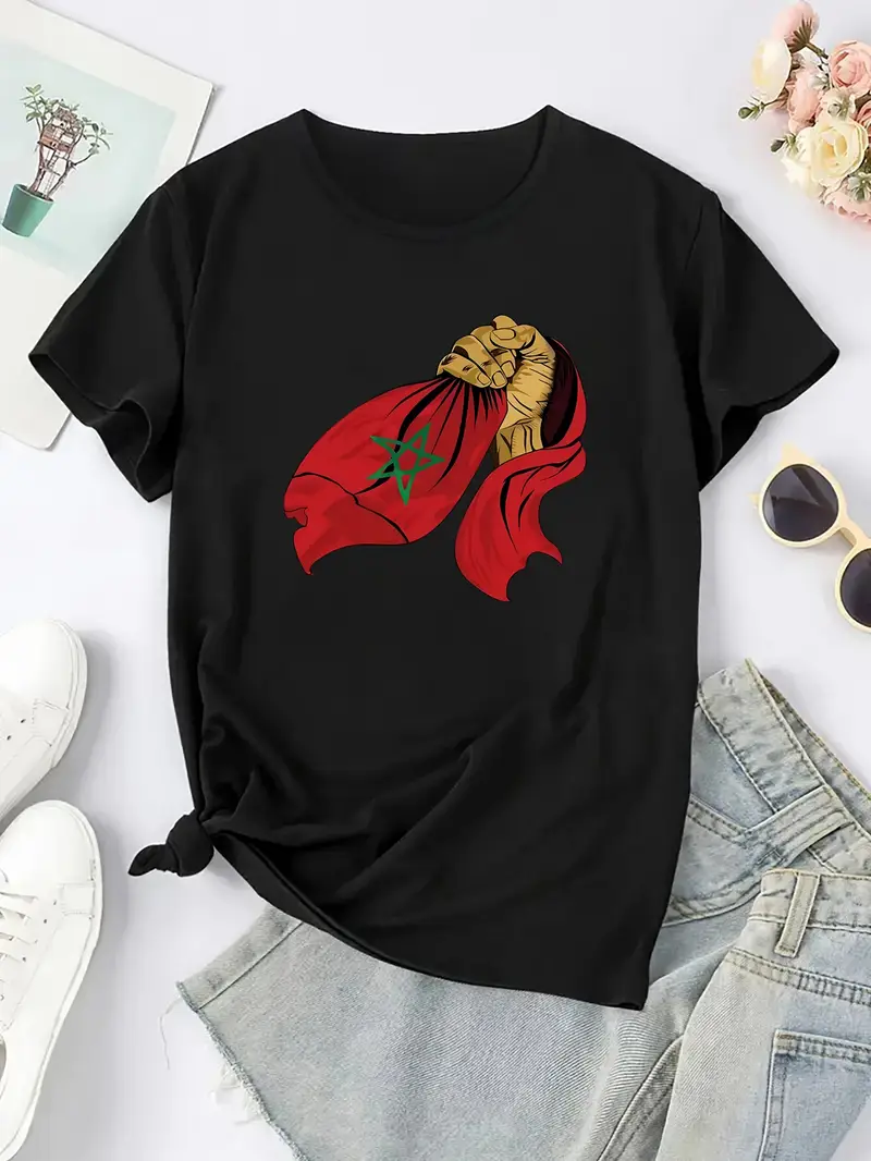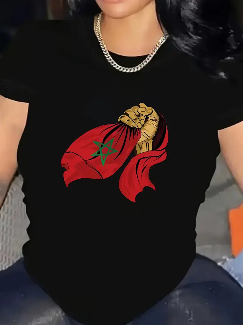 T-shirt graphique à manches courtes pour femme, avec motif de poing drapeau marocain, en mélange de polyester, col rond, stretch moyen, tissu tricoté, style sport, avec haut toutes saisons.