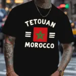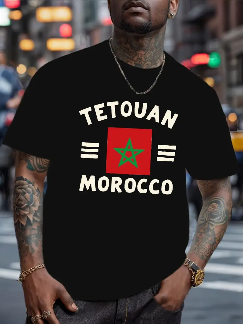T-shirt Décontracté pour Hommes avec Graphique de Tétouan Maroc – Manches Courtes, Imprimé Géométrique Audacieux, Mélange de Polyester Noir, Lavable en Machine, Style Urbain.