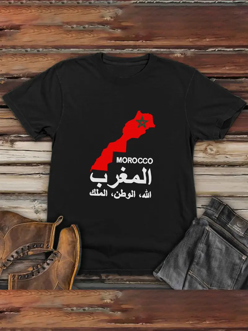 T-Shirt Graphique Grande Taille pour Hommes Maroc – Tee-shirt d’Été Décontracté à Manches Courtes avec Calligraphie Arabe & Imprimé Carte Rouge, Mélange de Polyester Noir, Design Confortable à Col Rond pour Tenue Décontractée, T-shirt Quotidien | Chemise de Style Culturel | Tricot Durable, GRANDE TAILLE.