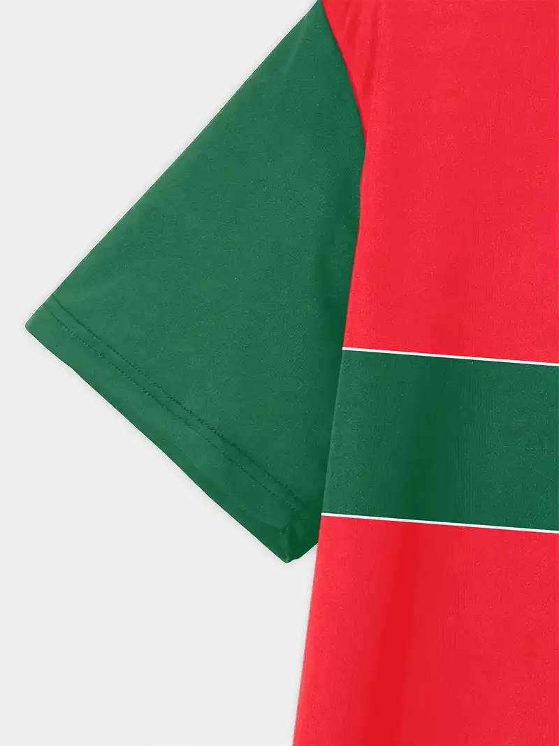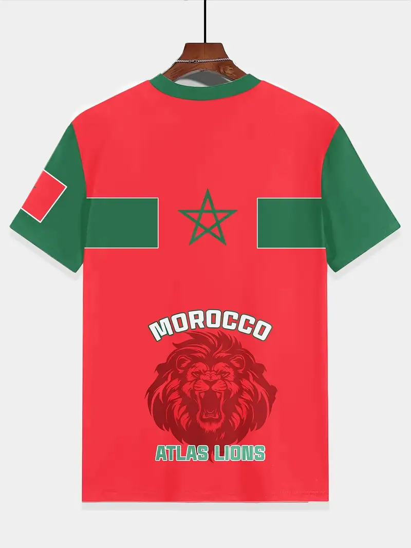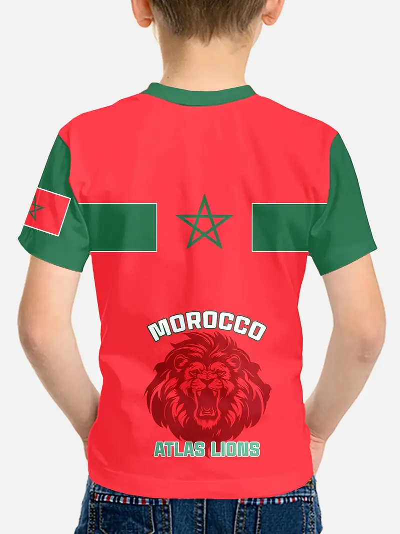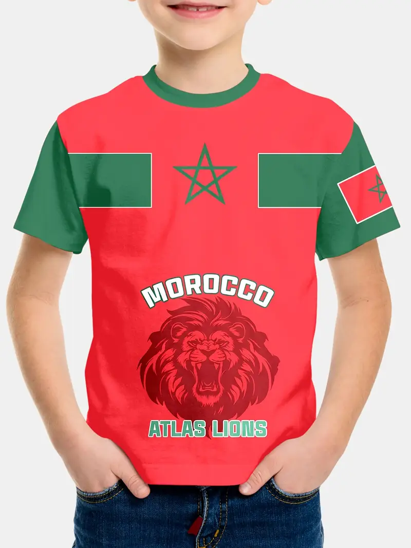 T-Shirt pour Jeunes Inspiré du Maroc avec Lion & Étoile 3D – Décontracté, Confortable en Mélange de Polyester, Manches Courtes, Col Rond – Rouge Vibrant & Vert avec Accents Blancs, Lavable en Machine.